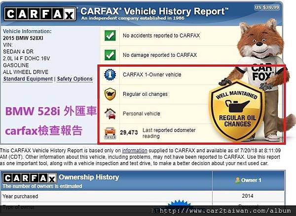 上圖是屏東趙哥這台寶馬BMW 528i F10 的Carfax檢查報告,下圖是Autocheck檢查報告。