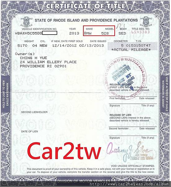 Car2TW專業團隊特別提醒趙哥的寶馬BMW 528i F10美國車主證在也等於是行車執照,所以一定要妥善保管。